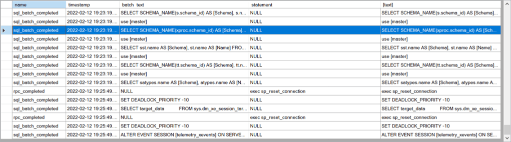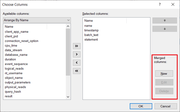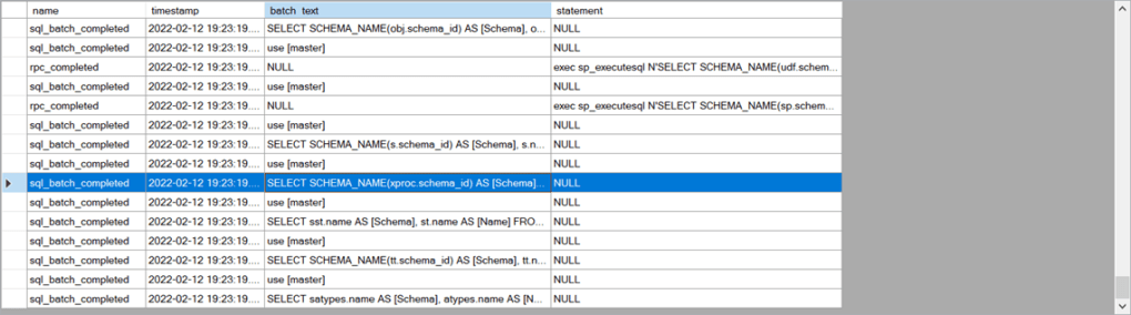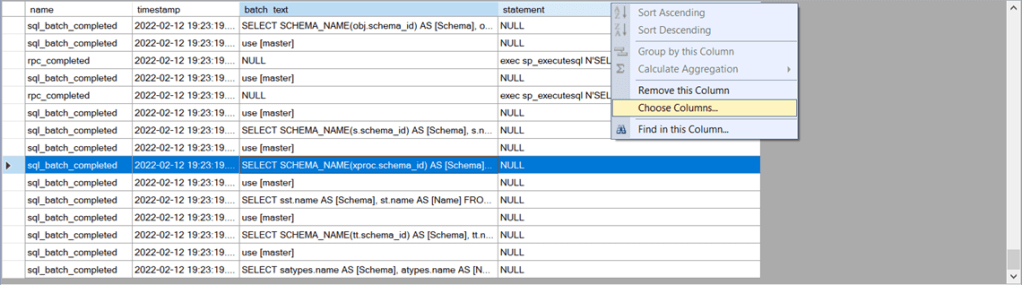 In this case, the rpc_completed event will have to rename its “statement” column to “sql” and the sql_batch_completed event will have to rename its “batch_text” column to “sql”. While we’re at it, let’s also create a column “total_io” that contains logical_reads + writes. Let’s see how you can do it: