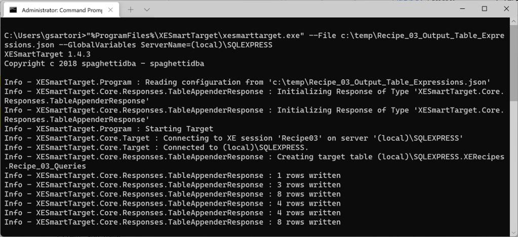 Let’s save this file as c:\temp\Recipe_03_Output_Table_Expressions.json and run XESmartTarget: