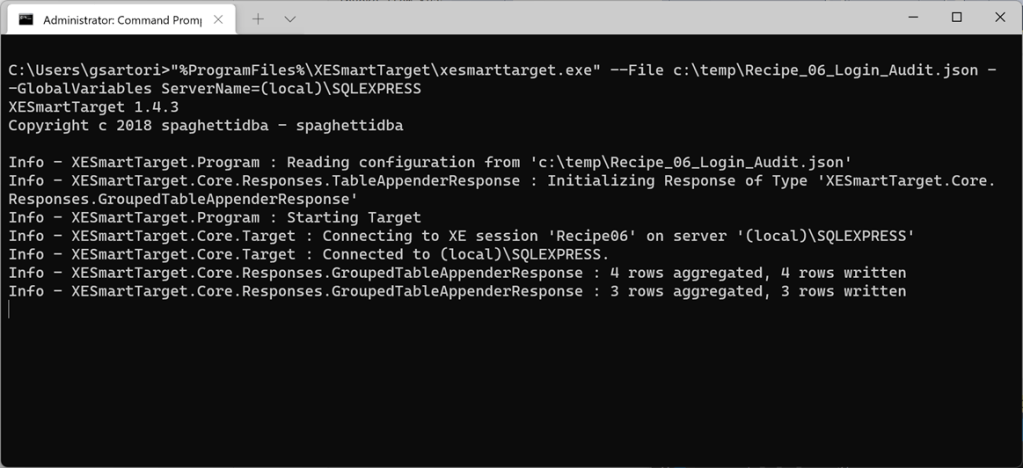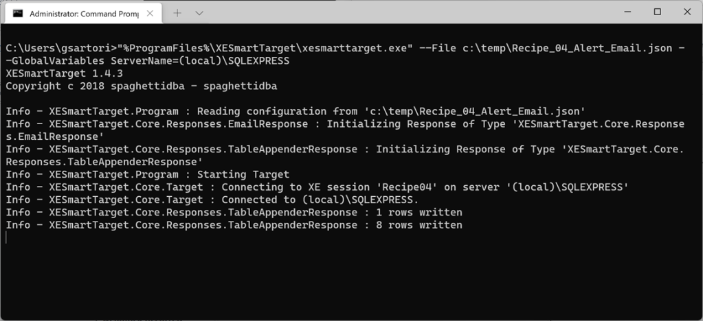 Let’s save the file as c:\temp\Recipe_04_Alert_Email.json and run XESmartTarget: