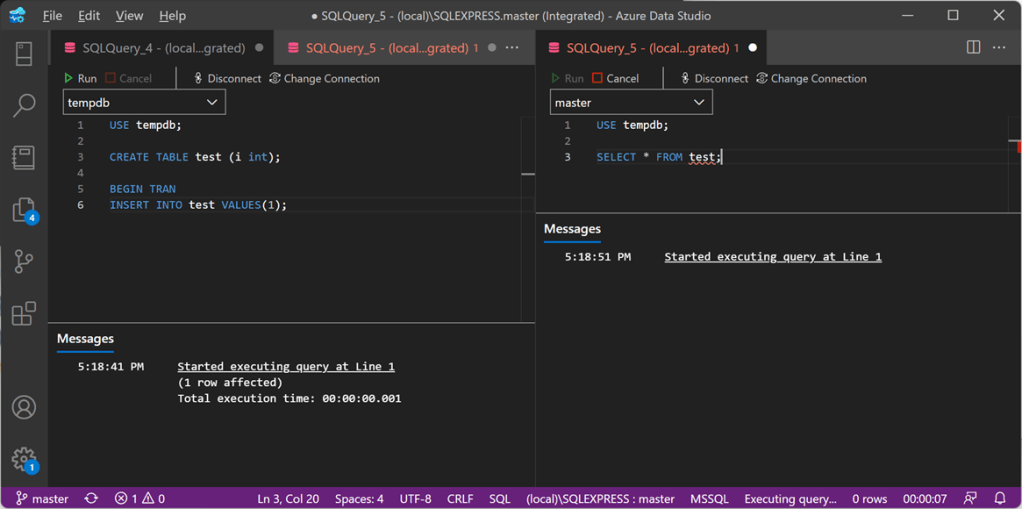 After 20 seconds of blocking, the session on the left gets killed and the blocked processes are free to continue. Yay!