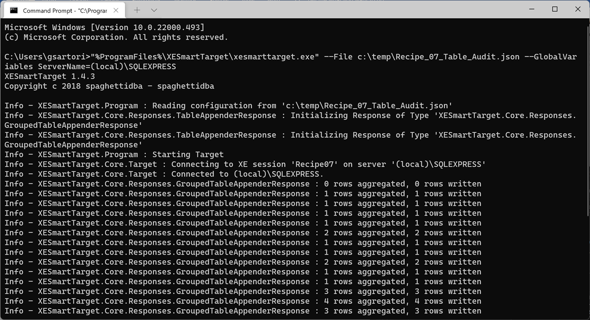 The output on the cmd window won’t tell you much, except that XESmartTarget is running, it’s connected to the appropriate session and the it’s writing to the CSV file.