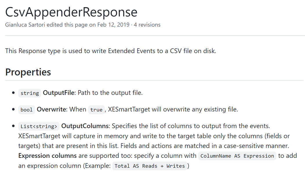 Another thing worth noting is the AutoCreateTable property: it controls whether XESmartTarget will attempt to create the target table based on the columns specified in the OutputColumns property. XESmartTarget will try to guess the correct data types, but it will have no way to determine the maximum length for string columns, so they will be created as nvarchar(max). If you want a more precise data type definition, I suggest that you create the table manually and set this property to false.